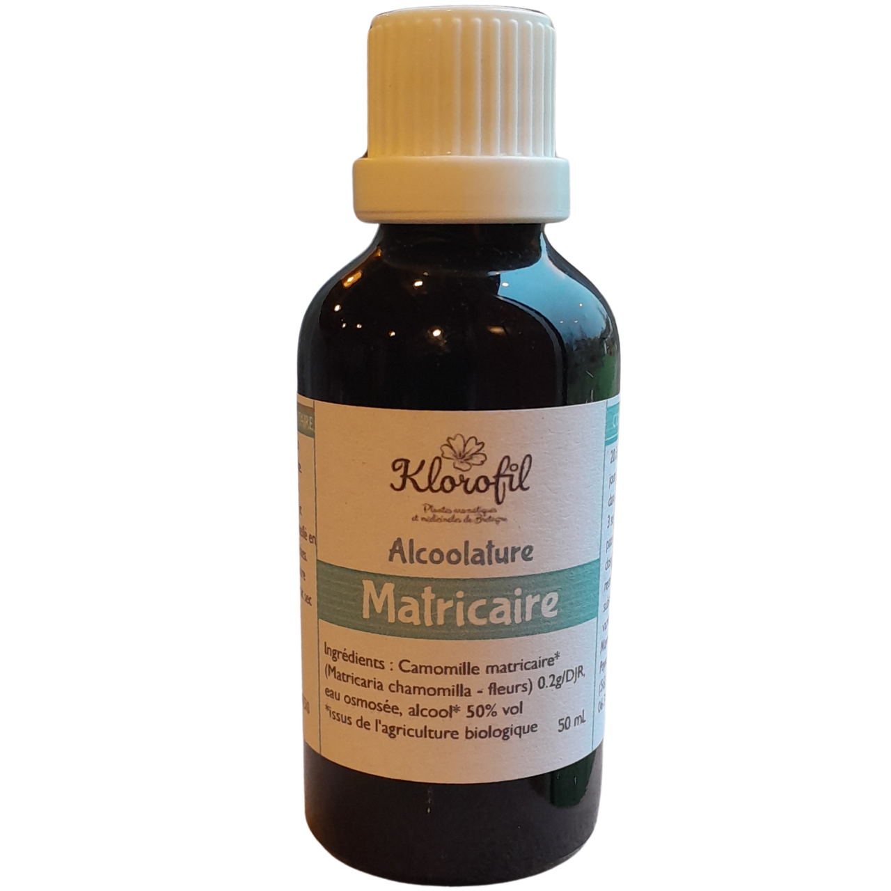 Composition: Alcool bio (50% vol.), Eau osmosée dynamisée, Camomille matricaire (Camomilla recutita) – Capitules