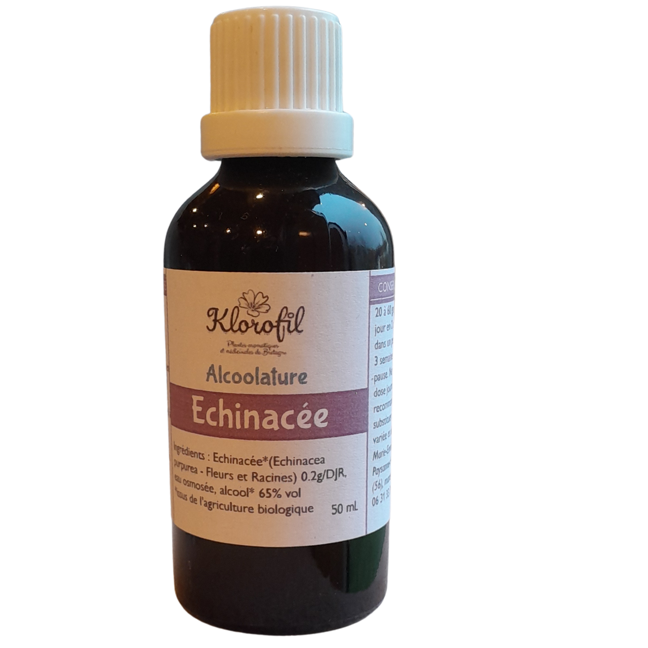 Composition: Alcool  bio (65% vol.), Eau osmosée dynamisée, Echinacée pourpre (Echinacea pupurea) – Capitules et racines